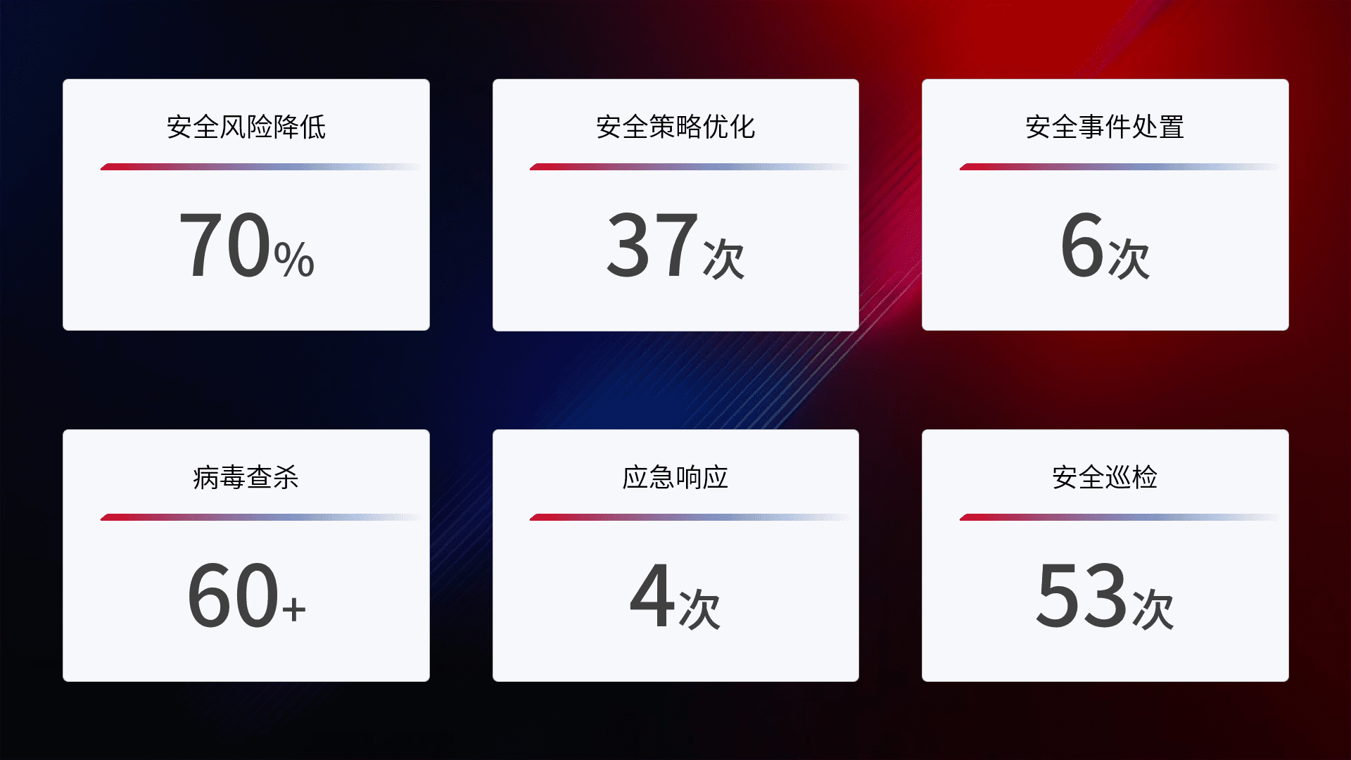提供全面的安全事件报告体系,,包括处置报告、、、、周报、、季度和年度总结,,结合持续监控,,帮助客户深入了解网络安全状况。。。。